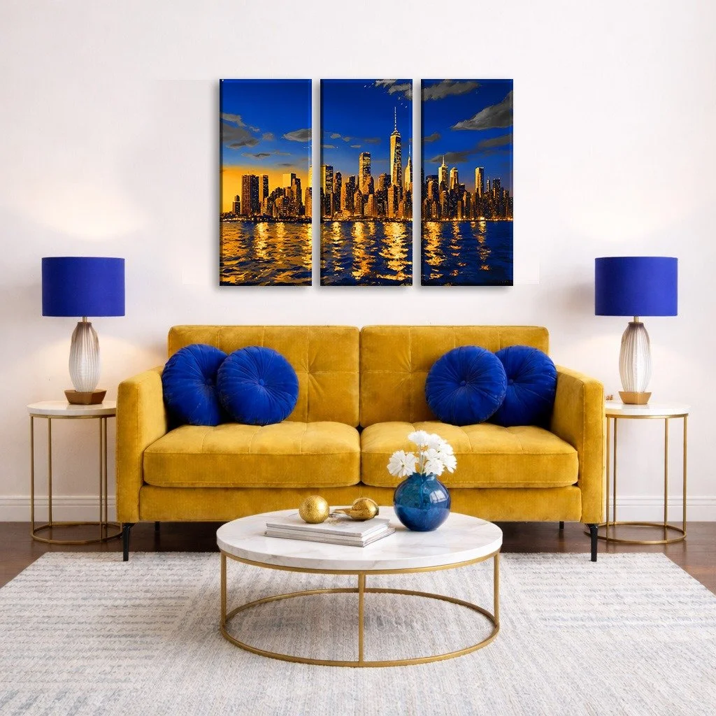 Shop › New York Skyline Royal & Gold Canvas Artwork (4 Size Options) Image 1 of 3 Image 2 of 3 Image 3 of 3 New York Skyline Royal & Gold Canvas Artwork (4 Size Options) from $84.99 Canvas Size: Select Canvas Size 18x24 1 Panel 12x12 3 Panel 24x36 1 Panel 18x24 3 Panel Add To Cart Added!